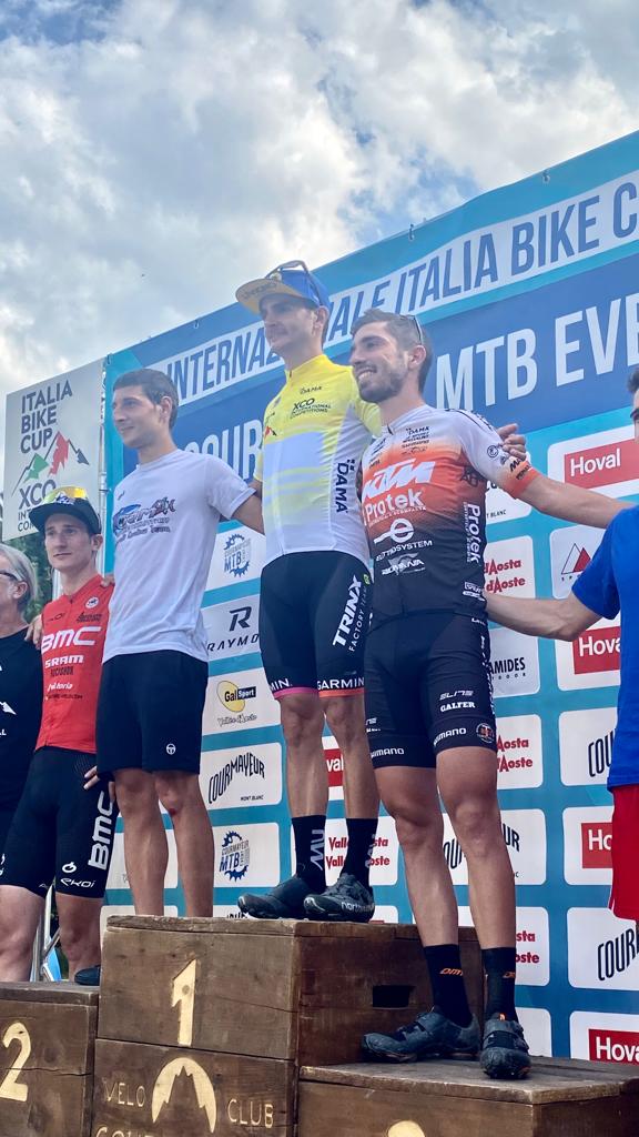 Dopo la vittoria a Samobor, Croazia e la brillante prova in Coppa del Mondo a Leogang, Austria, Alessio Agostinelli è protagonista della gara valdostana, tiene la testa del gruppo per metà della gara, deve rallentare la sua corsa per un problema dii respirazione, si sblocca e ritorna a pedalare bene e recupera posizioni, porta la sua KTM Scarp al traguardo in 3^ posizione.Posizione che viene confermata anche nella generale del circuito Italia Bike Cup. Buona la prova dei due Under 23, Yannick Parisi, chiude in 14^ posizione, poco dietro, Michael Pecis, 22°.