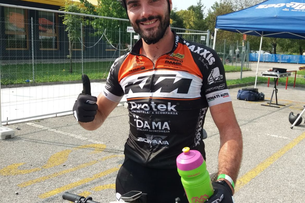Il “Capitano” Mirko Tabacchi si presenta alla gara, in versione cronometro, La Via del Mare Mtb, a Polcenigo, Pordenone, alla quale erano presenti alcuni Elite, tra questi Colledani, Fontana e Taffarel.